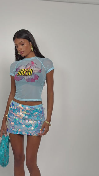 The Tina Skirt in Blue – A dazzling mini skirt made from ultra-stretchy jersey and covered in shimmering iridescent blue sequins. Designed to catch the light and turn heads, this piece adds instant glam to any look. Perfect for parties, nights out, or whenever you're feeling bold. Pairs perfectly with the Gia Tee in Blue
